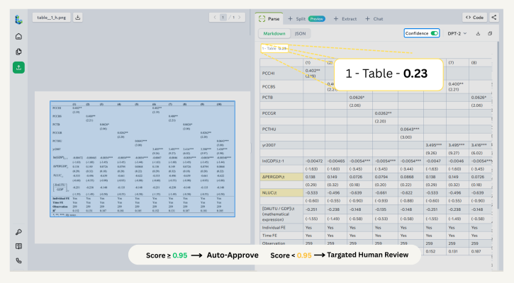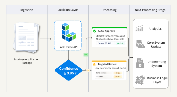 Integrate via API : Once you understand how parsing works, use the ADE Parse API to bring confidence scores into your pipeline. The grounding object gives you everything you need to build custom routing and review logic. See the confidence score documentation for the complete field reference.