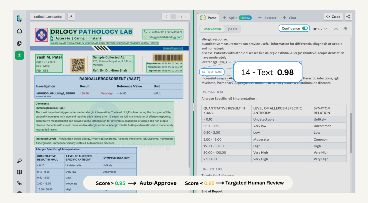 - Straight-through processing : Automatically pass documents through your pipeline without human review when all chunks clear your confidence threshold.
