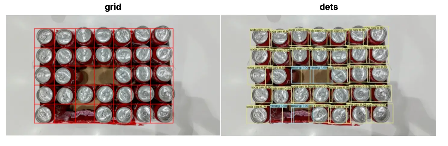 Given that the agent now has the locations of all the soda cans, it can use this information to construct a grid pattern over all the soda cans. Finally, given the soda can detections, and the full grid, it can simply check if each cell contains a soda can detection; if not, it can be counted as a missing can.