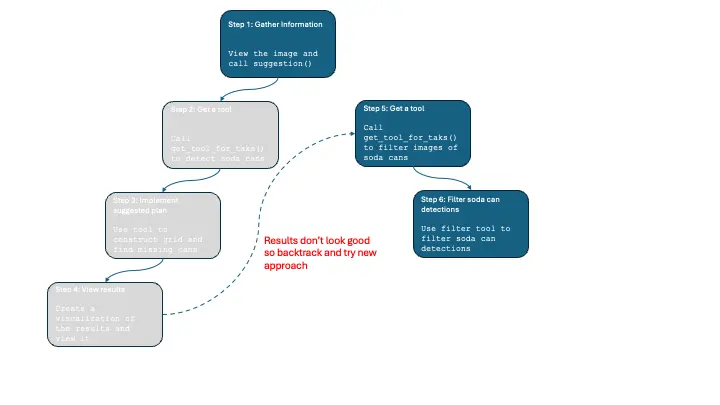 Now that we have covered all 3 components: agentic tool selection and subtasks, composing subtasks and visual design patterns, how do they all work together? We give the planner agent a budget of 10 steps to make when trying to solve a problem, and we also give the planner the ability to use libraries like Matplotlib to plot and visualize results. This allows the planner to go down a path, decide it doesn’t like the results, and then backtrack and find a new path. For example, the planner could use the plan we have described in this blog to find soda cans, but after visualizing the results decide that CountGD did not do a good enough job. It can then backtrack and find a tool to filter the CountGD results such as SigLIP, and then start a new plan where it crops the CountGD objects and filters them with SigLIP to improve performance.