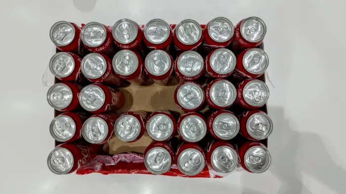 Explanation: Based on the arrangement shown, it appears the soda cans were originally packed in a rectangular grid. A common configuration for large packs of soda cans (such as a 30-pack) is a 6-by-5 grid, totaling 30 cans. If we assume the original arrangement was a full 30-can pack (6 cans across by 5 rows deep): The outer “border” layer of such a rectangle consists of: