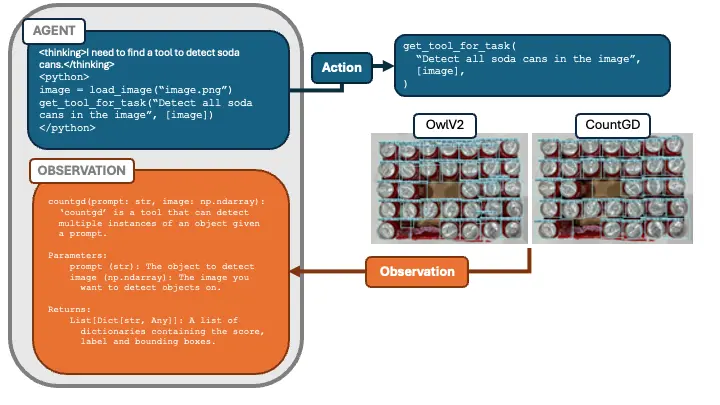 The agent uses ‘get_tool_for_task’ to compare multiple detectors (OwlV2 and CountGD), automatically picking the one best suited for soda-can detection.