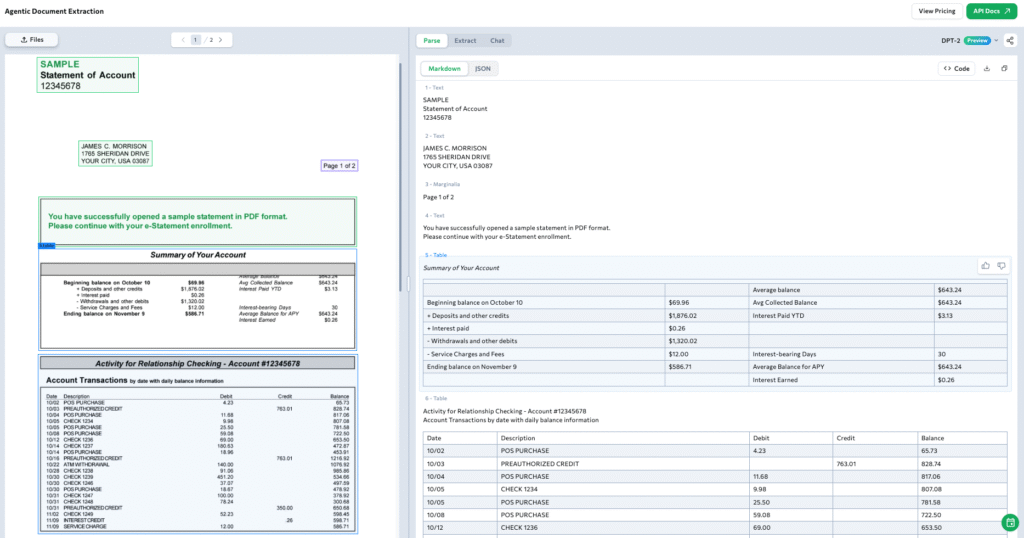 LandingAI stood out for its ability to extract structured information from highly complex documents without requiring templating or any training. Its Agentic Document Extraction (ADE) platform combines: