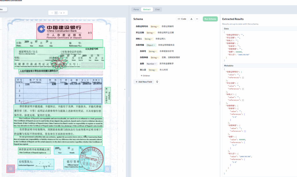 Organizations processing deposit certificates from multiple banks face format variability and multilingual content. ADE extracts verification-critical fields directly from Chinese documents: