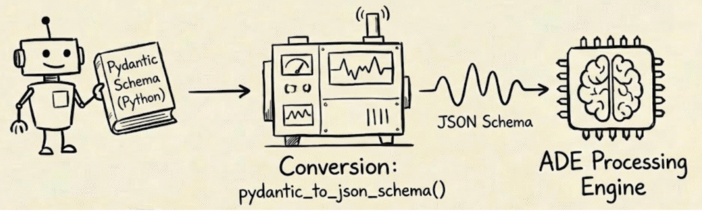 We need to convert the Pydantic class into a JSON schema. Why? This is because the ADE processing engine is language-agnostic; it doesn’t speak Python, but it perfectly understands JSON , the universal language for data structures. Think of this as translating your “Treasure Wish List” from a private notebook into a standardized radio signal that the DPT can interpret with 100% technical precision.