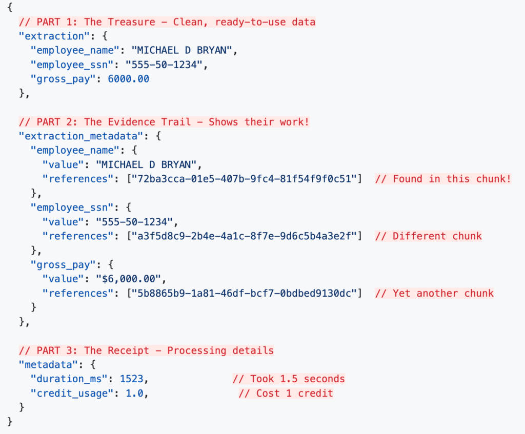 The Extractor doesn't clutter your clean JSON data with bounding box coordinates. Instead, it leaves a trail of reference in the .extraction_metadata object. For every field it extracts, it lists the specific Chunk IDs it used to find that answer.
