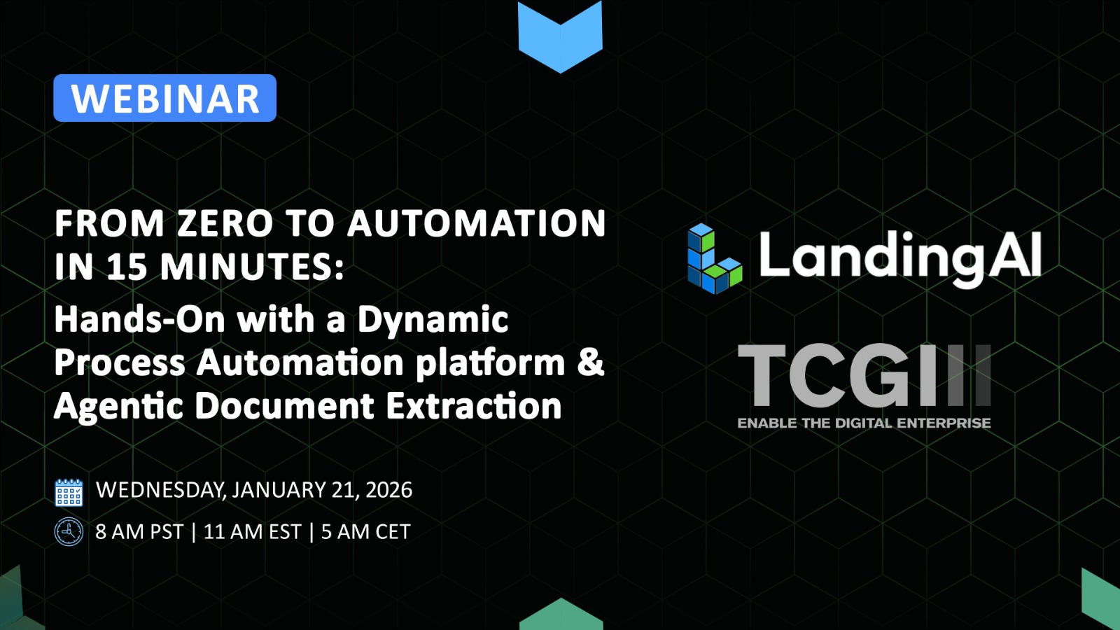 upcoming, webinars Office Hours: Agentic Document Extraction On Demand Webinars LandingAI January 15, 2025 Office Hours: Agentic Document Extraction Ron Baumert, Ava Xia, Seshu Reddy, Emilie Cooksey, Bianca Ragsdale January 21, 2026 From Zero to Automation in 15 Minutes: Hands-On with a Dynamic Process Automation platform & Agentic Document Extraction