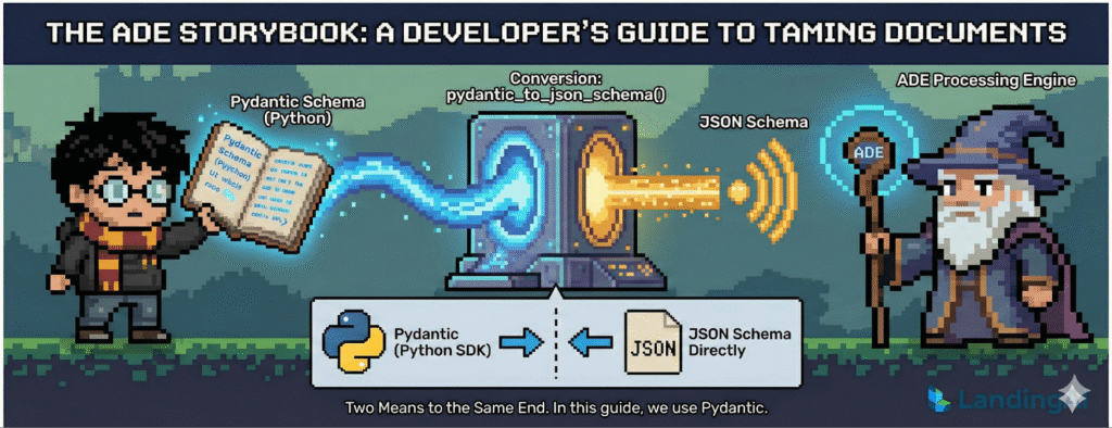 - Pydantic: Write a Python class, then convert it with the landingai-ade python SDK’s pydantic_to_json_schema() helper. Great when you’re building from scratch in Python.