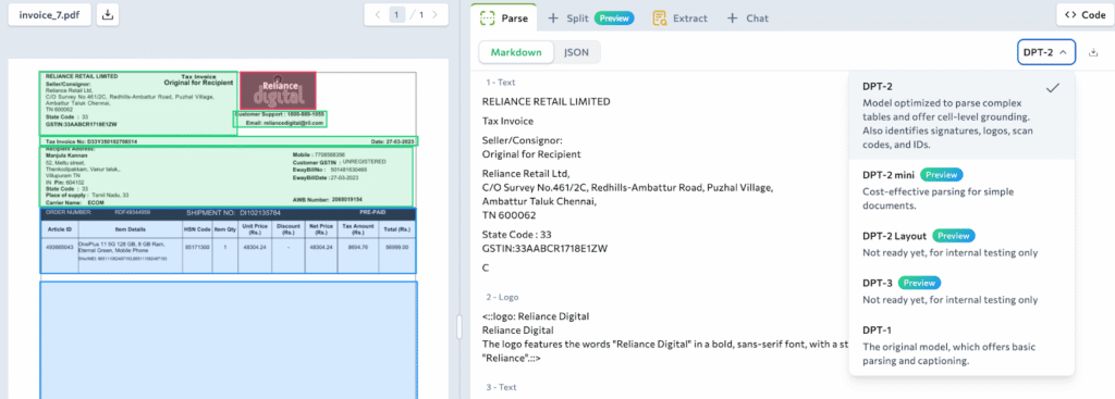 The magic behind this transformation is the Document Pre-Trained Transformer (DPT), a specialized model developed by LandingAI that powers ADE which “sees” the document’s structure and “reads” its content all in one go.