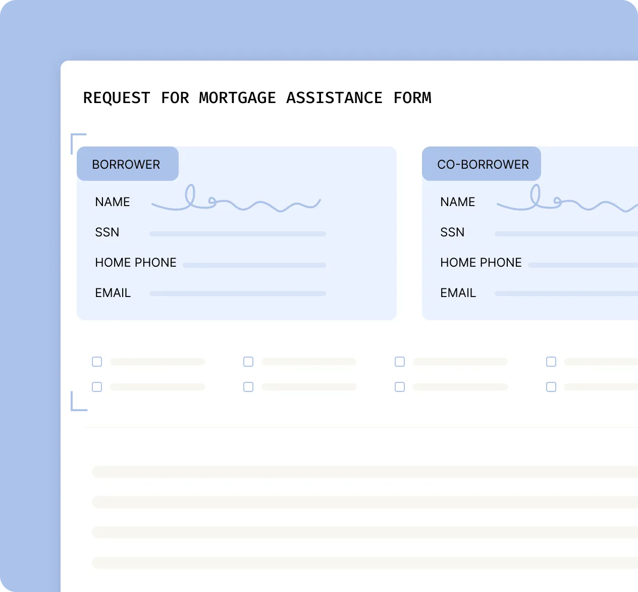 Extract borrower data from application forms and user-supplied supporting documents including proof of income, proof of assets, and identity documents.